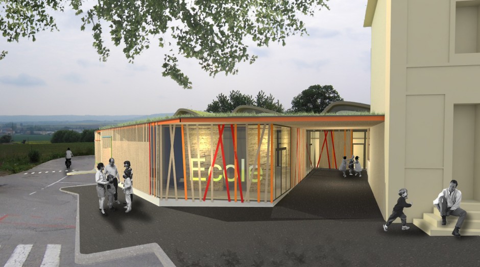 Pour répondre à une insertion urbaine particulièrement sensible (centre bourg de Chonas l’Amballan, (connexion avec le bâtiment existant Jules Ferry, périmètre du château…) le projet se développe sur un seul niveau pour « rester le plus bas possible » dans le respect des volumes existants. De cette manière, l’extension scolaire ne constitue pas de masque solaire pour la cour de l’école maternelle.